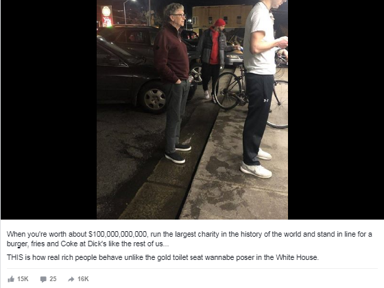माइक्रोसॉफ्ट के एक पूर्व कर्मचारी ने इस फोटो को फेसबुक पर शेयर किया है. तस्वीर में वे अमेरिका के सिएटल में Dick नाम के रेस्त्रां के बाहर खड़े दिख रहे हैं. इस तस्वीर को पहले माइक्रोसॉफ्ट एलुमनी ग्रुप में पोस्ट किया गया था.बिल गेट्स इस वक्त अमेजन के मालिक जेफ बेजॉस के बाद दूसरे सबसे अमीर व्यक्ति हैं. उनकी संपत्ति 68,68,98 करोड़ रुपये है. माइक्रोसॉफ्ट के पूर्व प्रोग्राम मैनेजर माइक गलोस ने फोटो शेयर करते हुए लिखा कि दुनिया के धनी लोग इस तरह व्यवहार करते हैं, न कि व्हाइट हाउस में सोने की टॉयलेट सीट के साथ फोटो क्लिक कराते हुए.